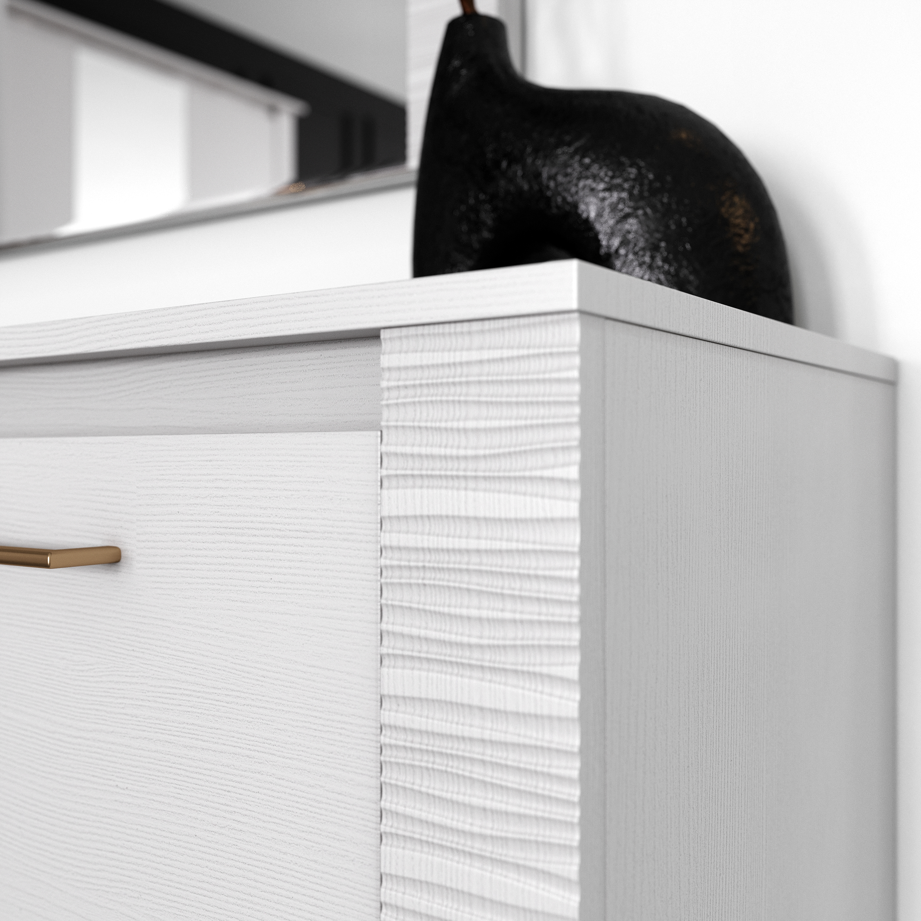 Комод оснащен четырьмя выдвижными ящиками на роликовых направляющих и двумя вместительными отделениями за распашными дверцами.