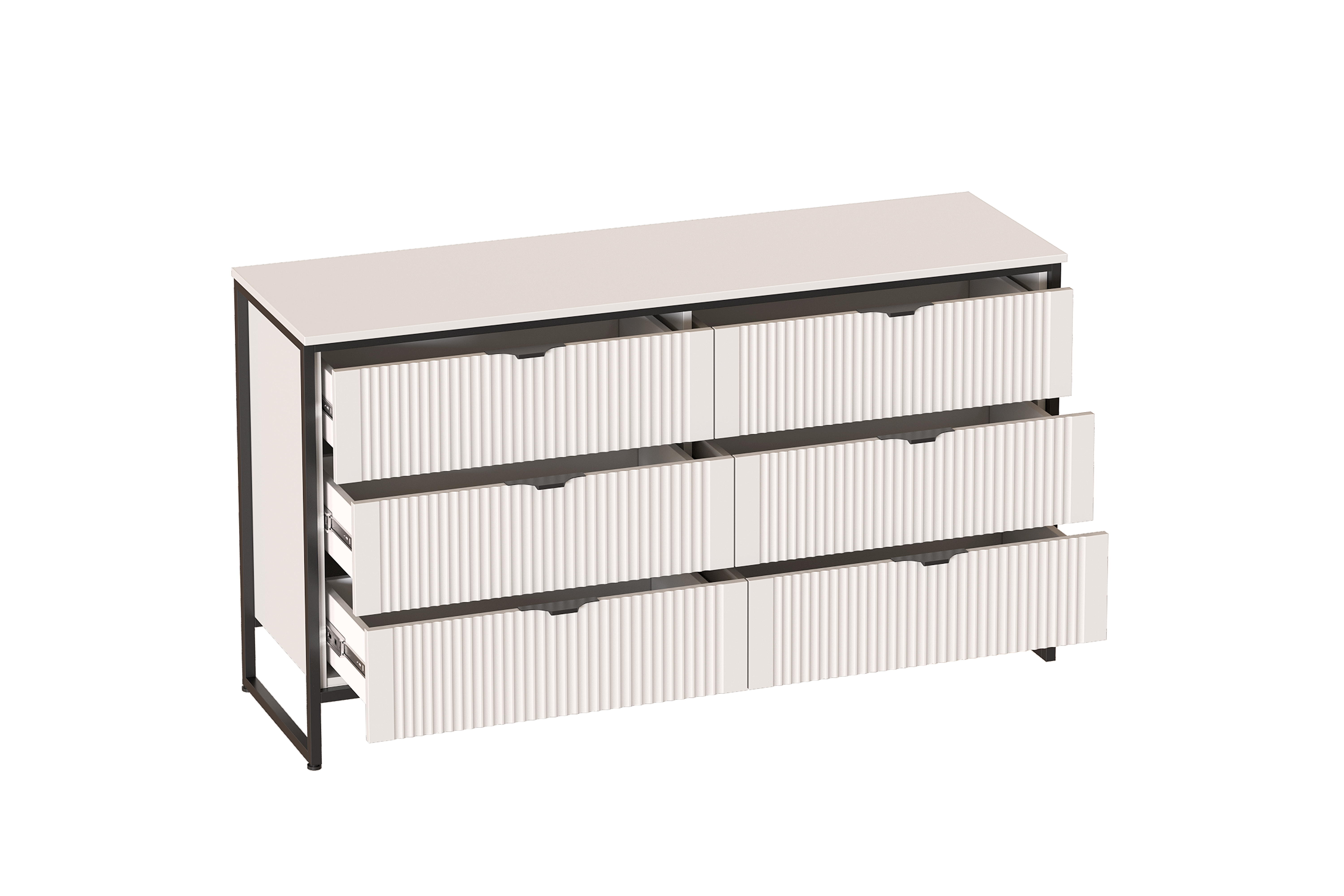 Комод "Нора" на металлокаркасе состоит из выдвижных ящиков, что позволяет удобно хранить вещи и поддерживать порядок в комнате. Внутреннее пространство разделено стенкой на два отделения, в каждом из которых установлены по три выдвижных ящика на шариковых направляющих с доводчиками. Он выполнен из безопасных, качественных материалов (лдсп и мдф), что гарантирует долговечность и сохранение первоначального вида на протяжении долгого времени.