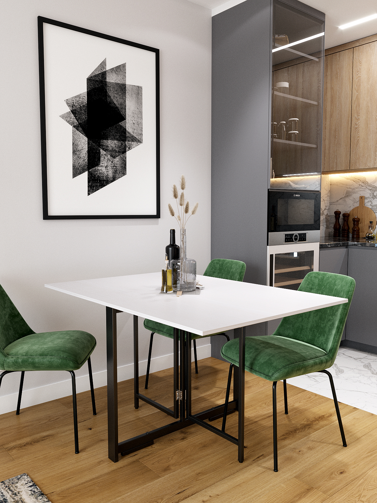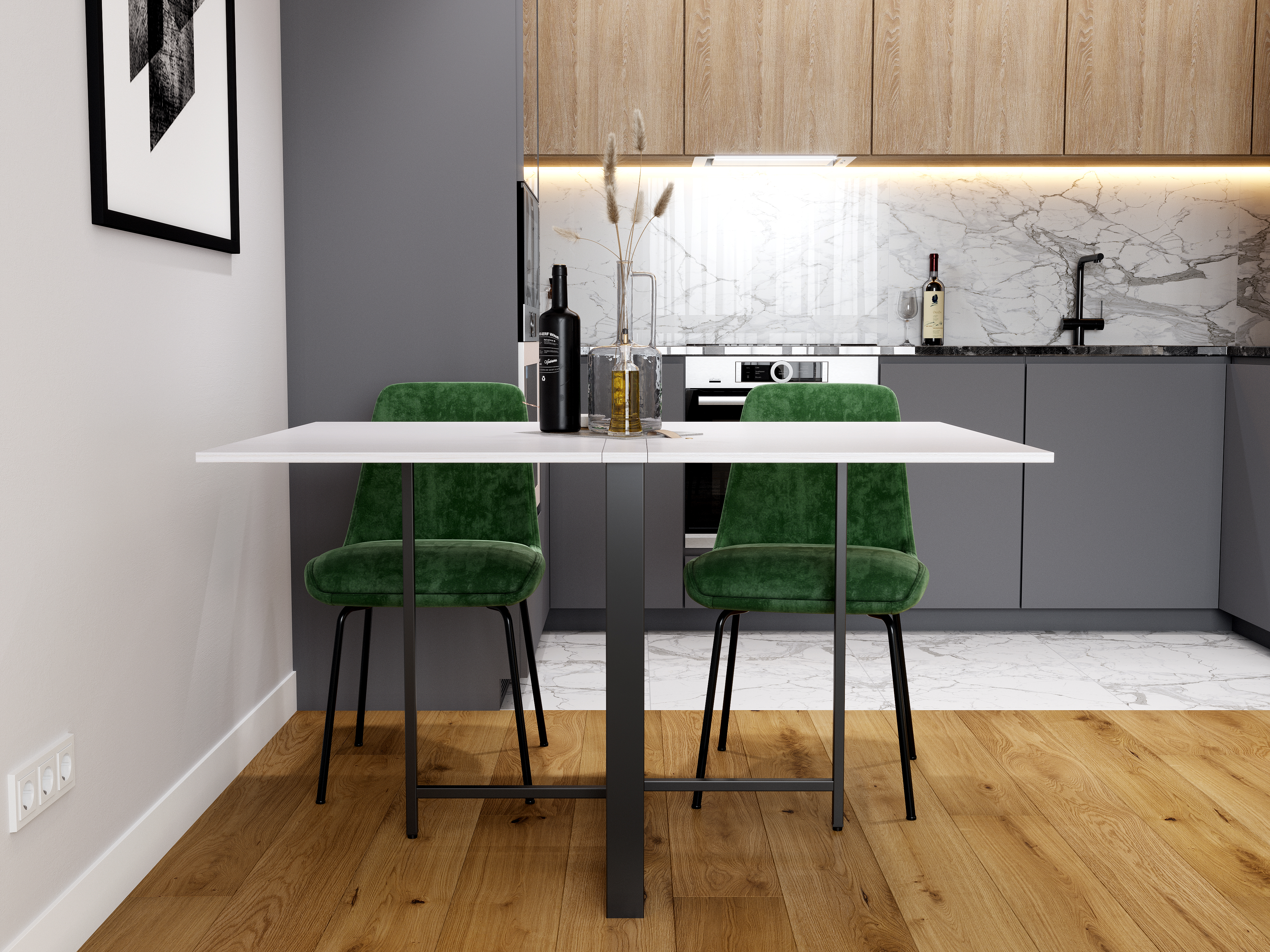 Раскладной стол "Брион 2" со столешницей из ЛДСП. Опорой для столешницы служит металлокаркас. В конструкции изделия предусмотрены регулируемые по высоте опоры.